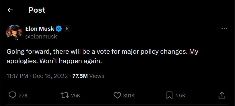 Elon Musk claimed when he first purchased twitter that any changes to twitter policy would only happen if a poll was done and the majority was happy with the decision.